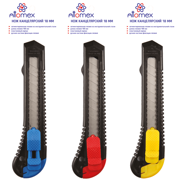 Нож канцелярский 18 мм Attomex ассорти в блистере/30/300