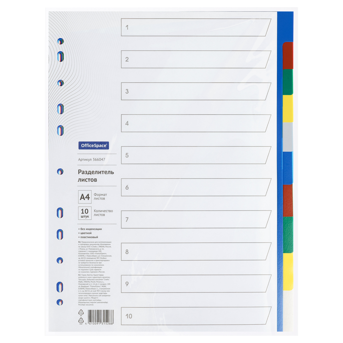 Разделитель А4 1-10 цветной пластиковый OfficeSpace/25