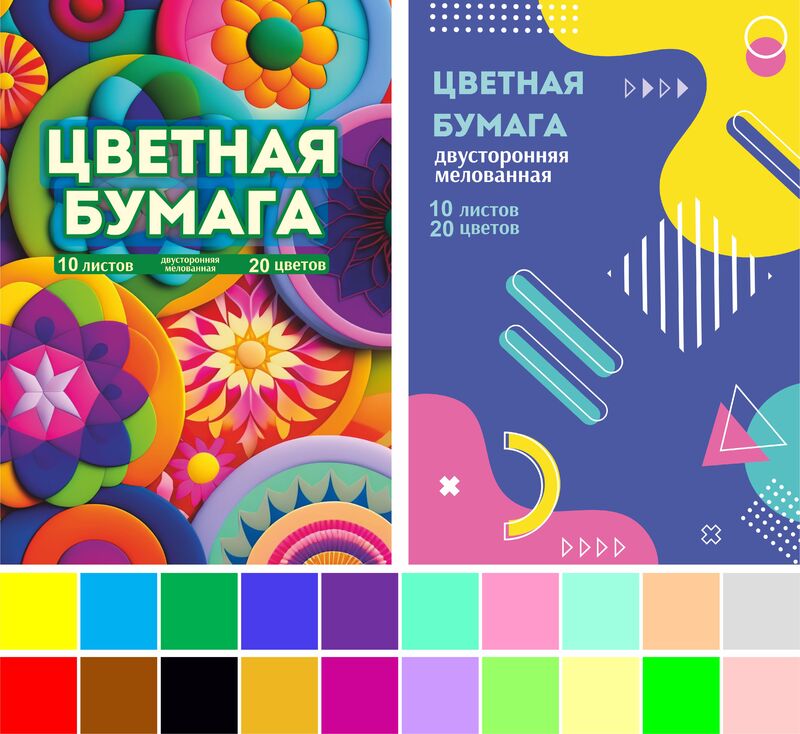 Бумага цветная А4 10л (20 цветов) мелованная двусторонняя "Палитра №1" 2 дизайна/100