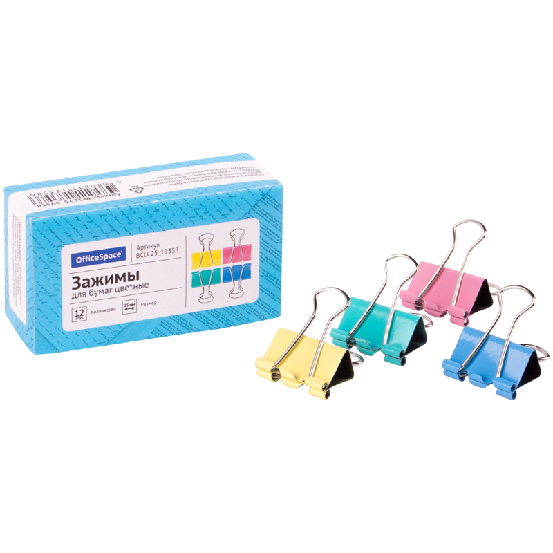Зажимы для бумаг 25 мм (12 шт) цветные в картонной коробке OfficeSpace/12/360