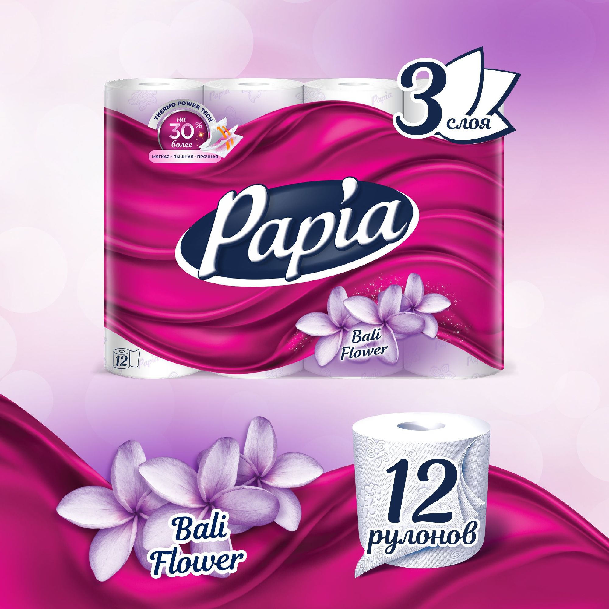 Бумага туалетная 1*12, 3 сл. Papia Bali Flower ароматизированная белая с рисунком/7
