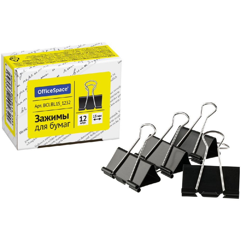 Зажимы для бумаг 15 мм (12 шт) черные в картонной коробке OfficeSpace/12/360