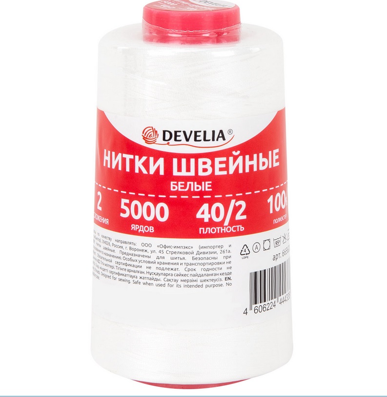 Нитки швейные 40/2 5000 ярд. (4572 м), 1 шт белые Develia