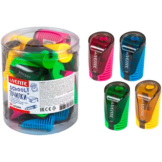 Точилка пластиковая с 1 отверстием и контейнером deVENTE School ассорти/24
