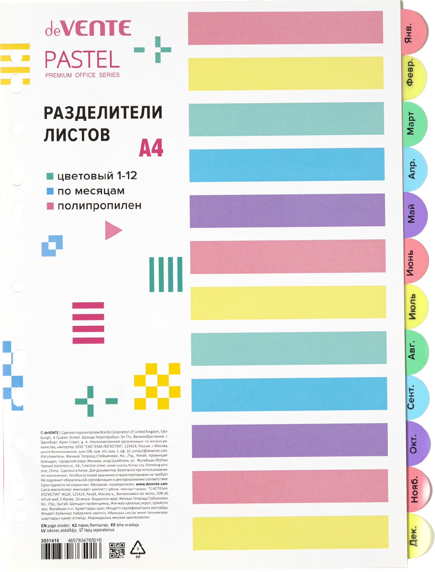 Разделитель А4 (январь-декабрь) пластиковый deVENTE Pastel/72