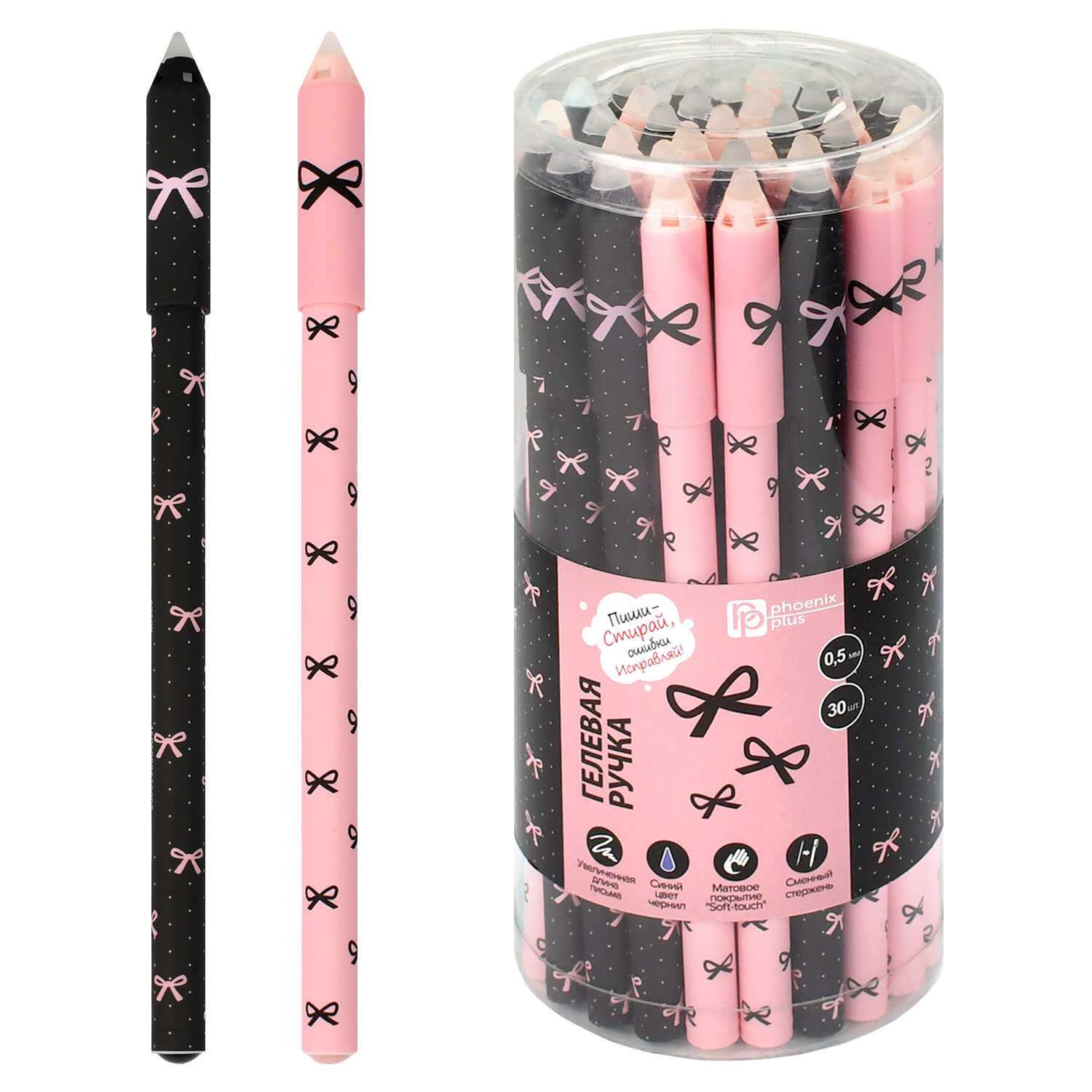 Ручка гелевая синяя 0,5 мм софт-тач Бантики "Пиши-стирай"/30