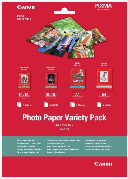 Набор фото-бумаги Canon: 5л PP-201 10x15 см (глянцевая), 5л SG-201 10x15 (полуглянцевая), 5л MP-101 A4 (матовая), 5л GP-501 A4 (глянцевая)
